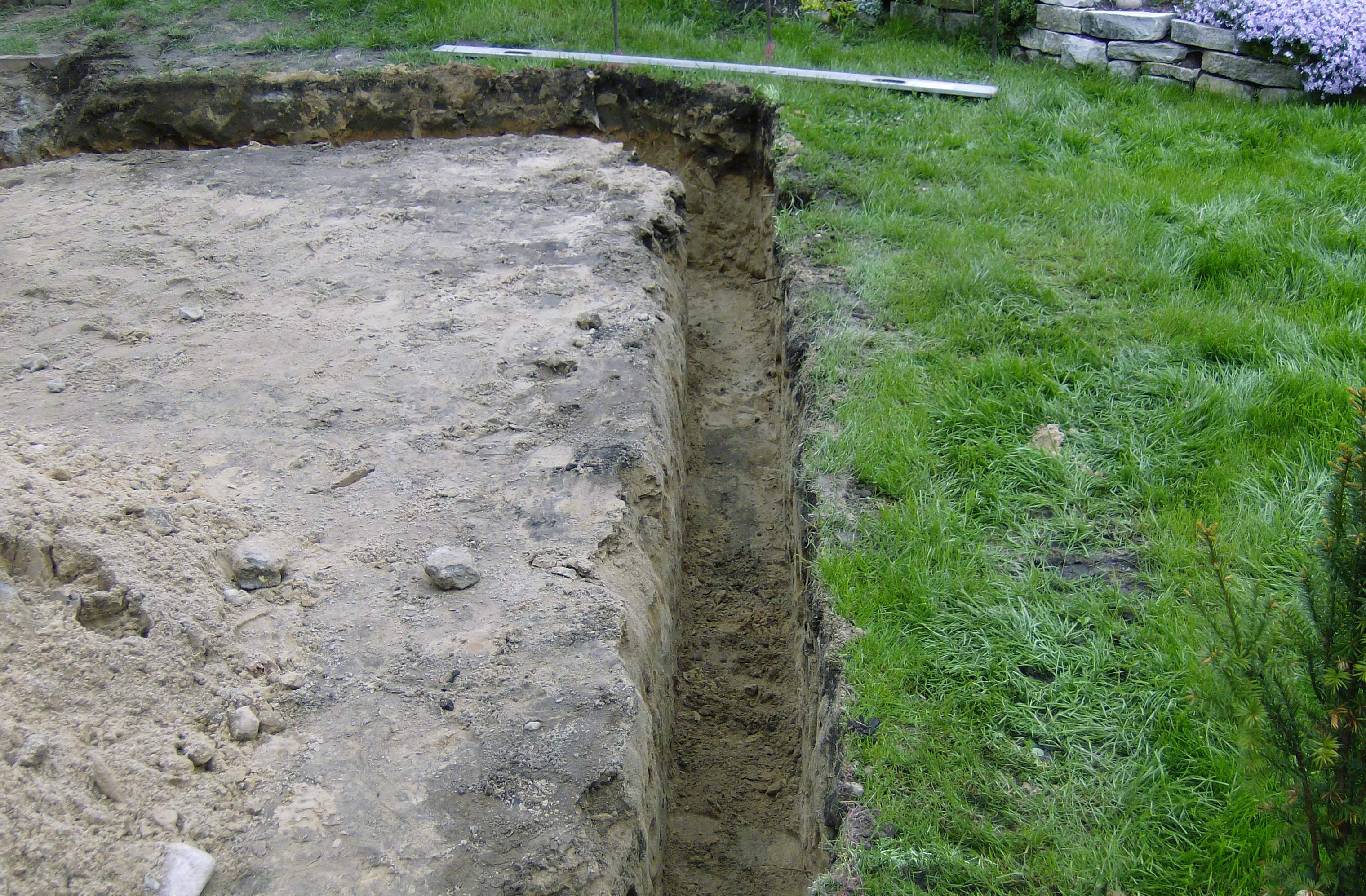 In jedem Fall ist der Oberboden zu entfernen und eine umlaufende Frostschürze herzustellen. Die Frostschürze verhindert Veränderungen im Bodengefüge unterhalb der Bodenplatte.